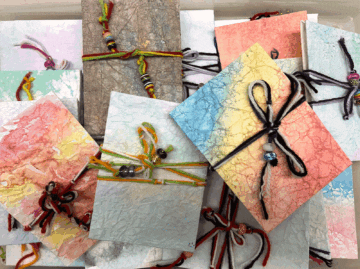 Art Room Show and Tell: Fall Installment 6th Grade Students are working on their Elements of Art books. Each page demonstrates a different element using a variety of materials. The covers of the books are made with faux rice paper made from crushed paper painted with watercolors, then embellished with a yarn and bead closure.…