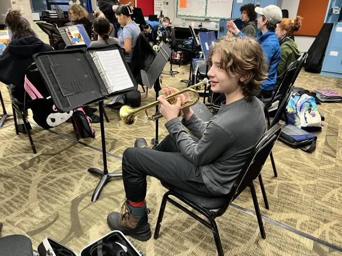 In 8th grade music, we have been pushing our skills with challenging music. Each group is working on two pieces, with one of them being a combined band/orchestra piece. In addition to continuing to work as an ensemble, the band and orchestra are both implementing new articulations/bow techniques, dynamics, and working in new time and key signatures as well as learning how to lead and rehearse in sectionals. Students are continuing to work on using accidentals in music and how accidentals can completely change the tone of a piece they are working on. Seeing students being able to identify notes not in the key signature and how they carry through each measure has been fun to see and listen to. In band, students have been working on pieces entitled “Dark Ride” and “Danger Zone”. In orchestra, students are working on an arrangement of the First Movement from Mozart’s “Symphony No. 40” and “Danger Zone”. We cannot wait to perform these for you at Spring Arts Night on May 23 at Chief Sealth International High School.