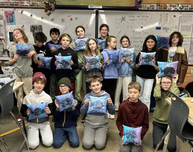 Students painted cotton panels with fabric dyes and then added a Gyotaku print. Gyotaku is the Japanese art of fish printing. These were sewn into pillows, stuffed, then hand-stitched closed.