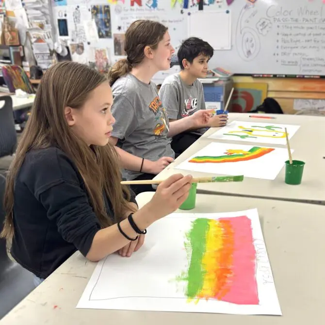Sixth graders just completed large colorful and textural paintings created while playing an art game called “Pass the Paint.”  The paints are set up around the tables in color wheel order. Students paint with a single color for several minutes and then pass the paint to the next artist. Eventually, the color wheel paints turn all the way around the tables.