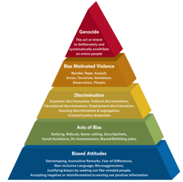 Eighth grade students finished a unit on the Holocaust, culminating in research essays on why it is important to interrupt what is called “lower-level hate” before it rises to more severe forms of hate. Students learned about the Pyramid of Hate (see below). We all know that the Holocaust was genocide, which is the most extreme form of hate, but students learned about earlier lower-level hate that targeted Jewish people in Nazi Germany and elsewhere. These slurs, name-calling, discrimination, and segregation went uninterrupted, and the hate rose on the Pyramid of Hate all the way to genocide. While modern examples of hate might not result in genocide, students learned it is critical to interrupt hate at early stages in order to prevent hate from rising up in severity on the Pyramid of Hate.